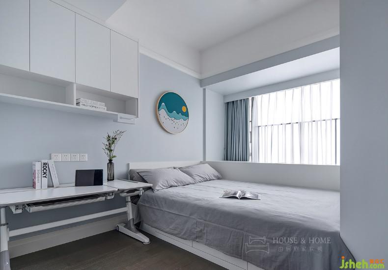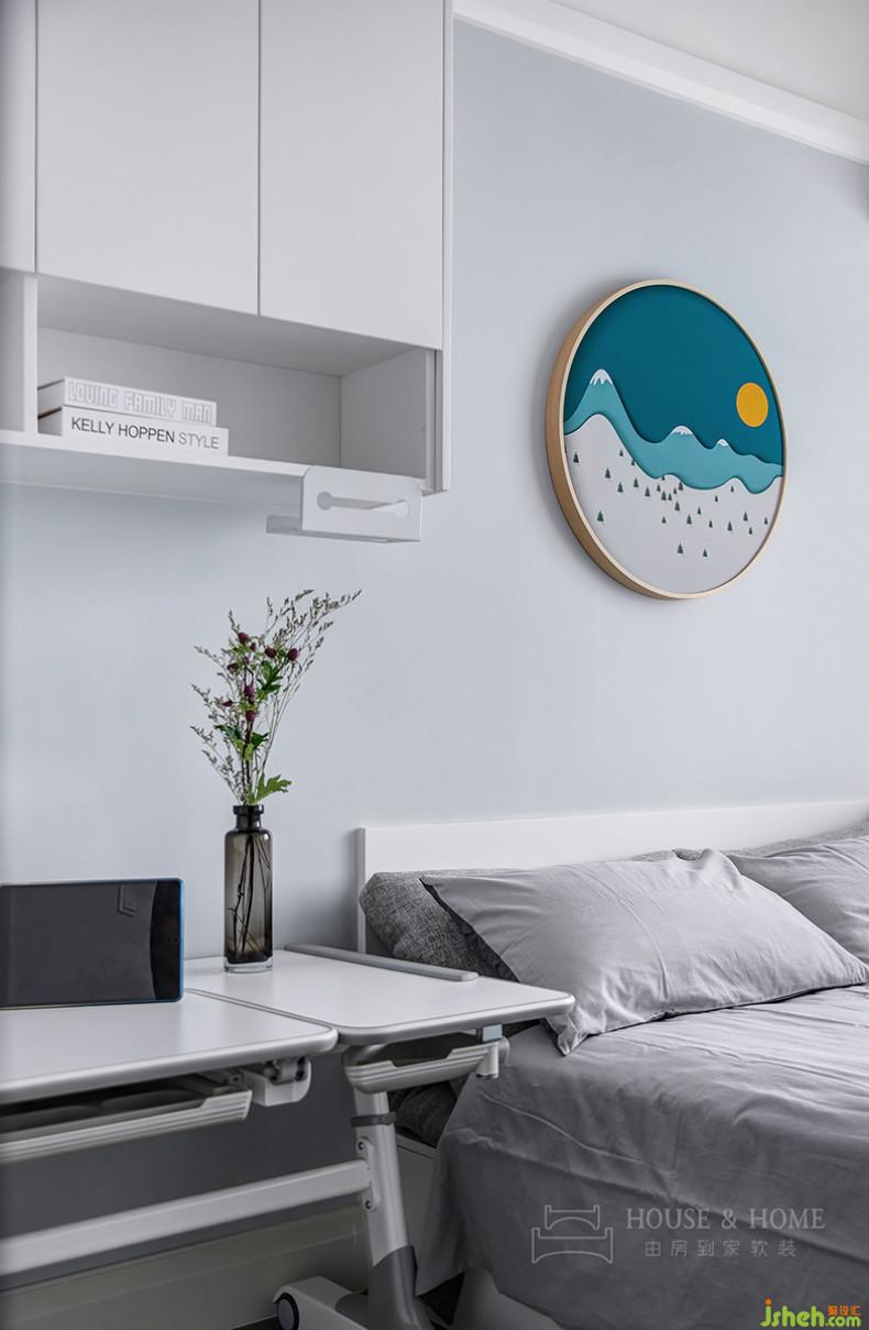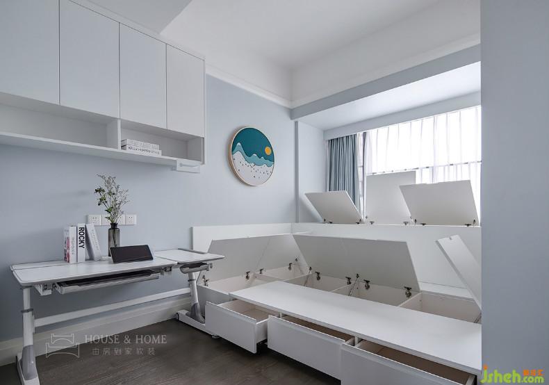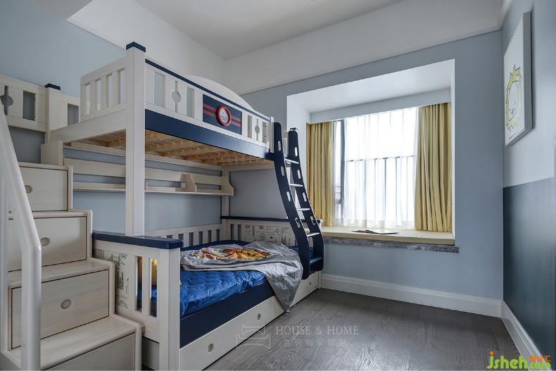目前孩子年紀(jì)尚小暫不考慮分房睡,因此選用高低床。孩子成長的不同階段,他們的的生活需求也會有所變化,室內(nèi)設(shè)計師在右側(cè)留白出大片空間,留待主人慢慢添加。