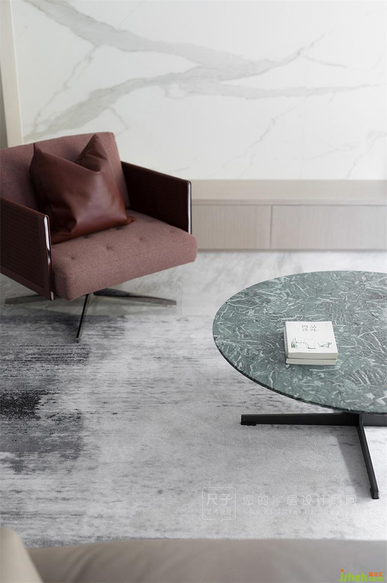 大理石紋的茶幾與地面呼應(yīng),皮布沙發(fā)造型各異,卻都保持簡(jiǎn)約,色彩上也多給人溫潤(rùn)、舒適的居家溫馨感。