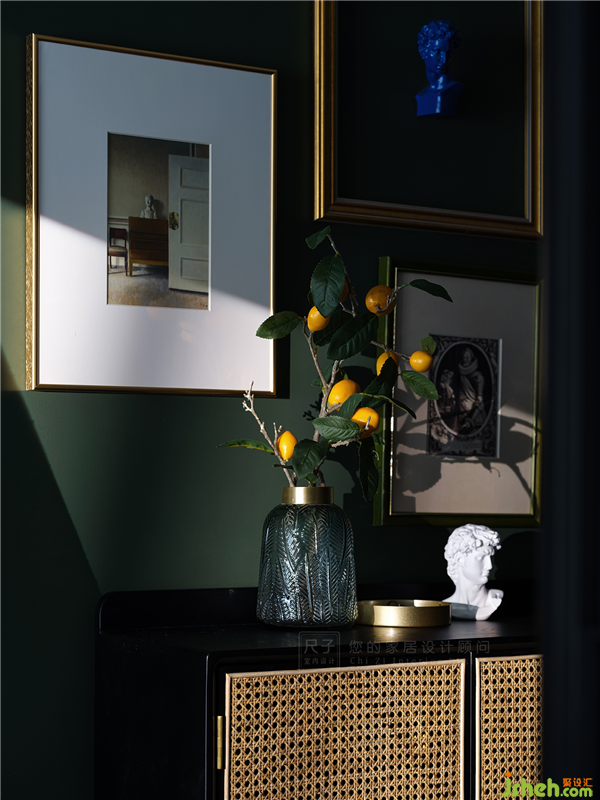 玄關處的暖色燈光為家居配飾打造出一個獨特的舞臺,松綠花瓶與檸檬果靜立在藤編鞋柜上,與不同色彩的掛畫組合,演繹一場萬種風情的戲曲。