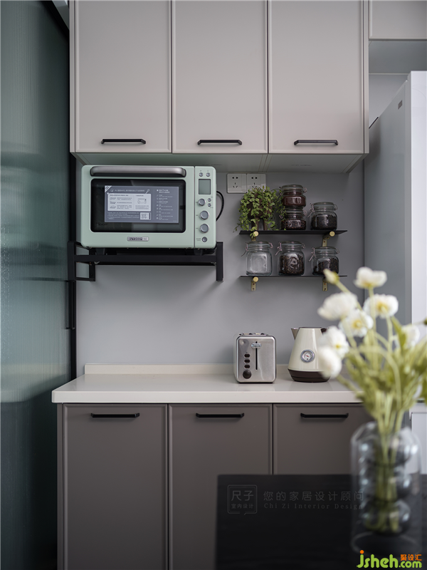 暖灰色餐邊柜上,薄荷綠電烤箱把空間從深色復古調拉入清新自然的現(xiàn)代風世界,隔板上的瓶瓶罐罐,帶著真實溫暖的煙火氣。