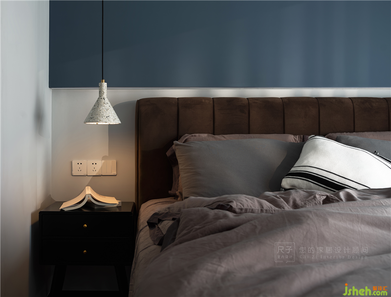 床頭一邊是自然垂落的吊燈,另一邊是簡(jiǎn)潔干凈的梳妝臺(tái),不對(duì)稱的設(shè)計(jì)賦予空間靈動(dòng)美感。