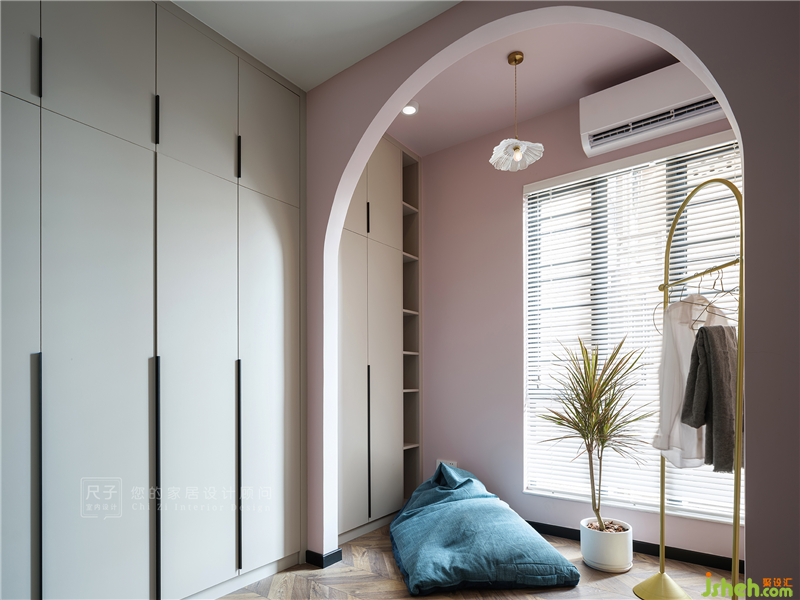 圓弧形造型門洞分割一小塊試衣區(qū),低飽和度的煙粉色,彰顯知性文藝的氣質(zhì)。