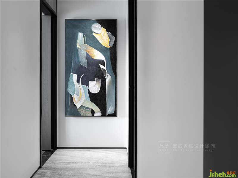 過道空間里,映入眼簾的是一幅抽象畫,強烈的立體形式與色彩碰撞,在靜謐的空間內(nèi)混合出獨特的律動感。