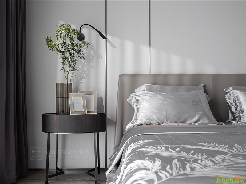 主臥簡約而溫柔。白色床頭墻,暖木色地板,兩側(cè)對稱的床頭柜與壁燈,現(xiàn)代優(yōu)雅的皮藝床鋪,呈現(xiàn)出輕松舒適的睡眠區(qū)。極少的色彩裝飾下,只是簡潔的白色和木色卻給我們一種舒緩與自然的純凈感。