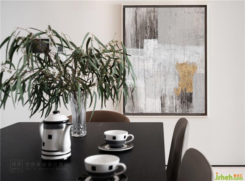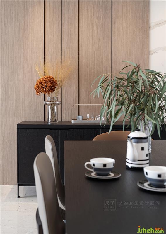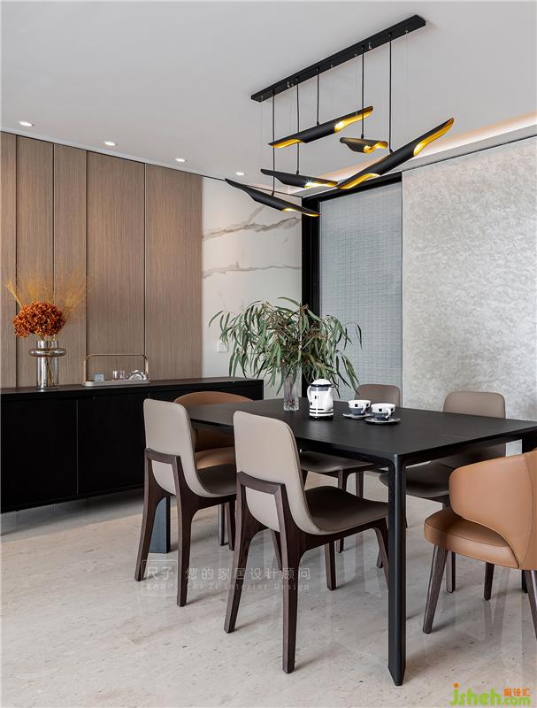 為延續(xù)空間的整體性,餐廳墻面采用了與客廳一致的材質(zhì)造型;褪去復(fù)雜的裝飾元素,高低錯(cuò)落護(hù)墻板與時(shí)尚輕靈的藝術(shù)涂料,從肌理效果上呈現(xiàn)了更多細(xì)節(jié)。