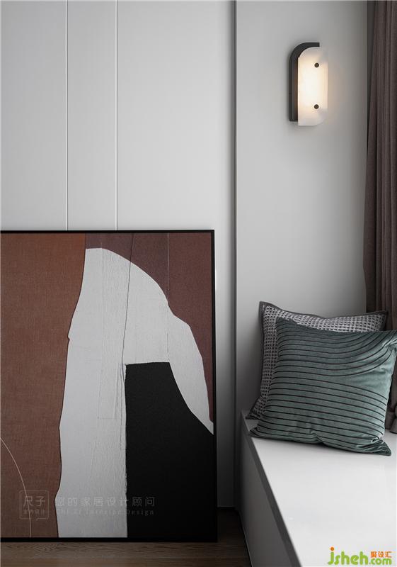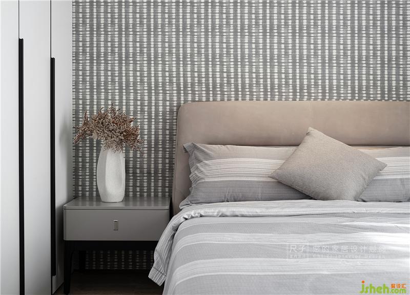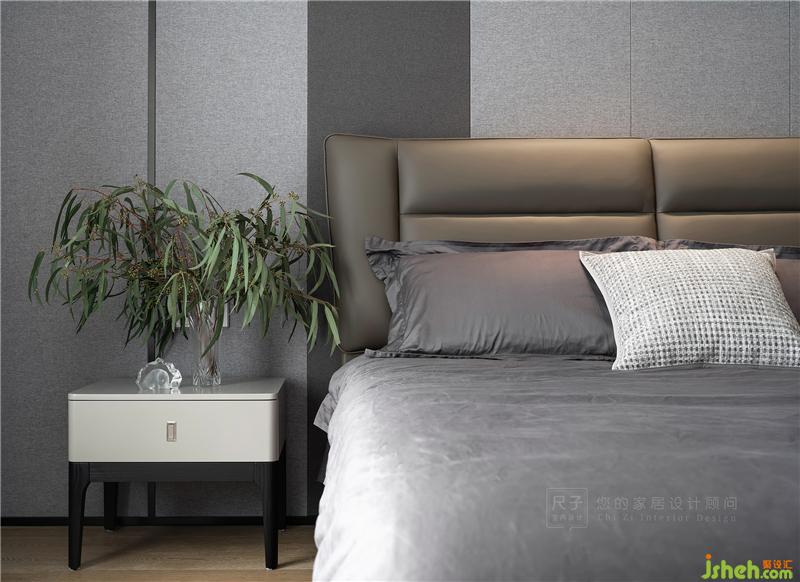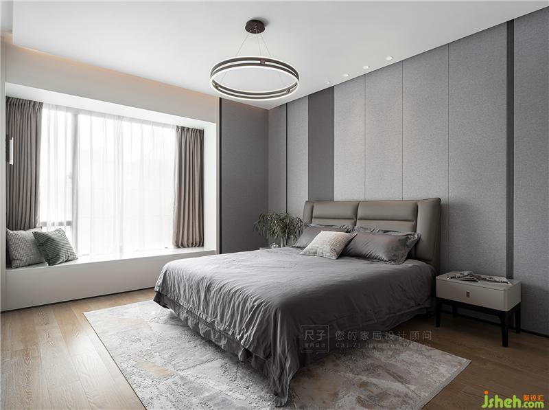 主臥充分考慮到夫妻二人的喜好,優(yōu)雅而克制。灰色硬包延伸至飄窗,形成圍合式布局,提升空間質(zhì)感。