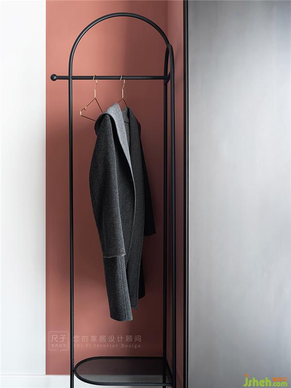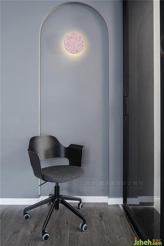 臥室以煙粉作為主色調,煙粉色從床頭向兩側延伸,形成半圍合的狀態(tài),給居住者足夠的心里安全感;黑白色的穿插又讓大面積的粉色不會過分甜膩。