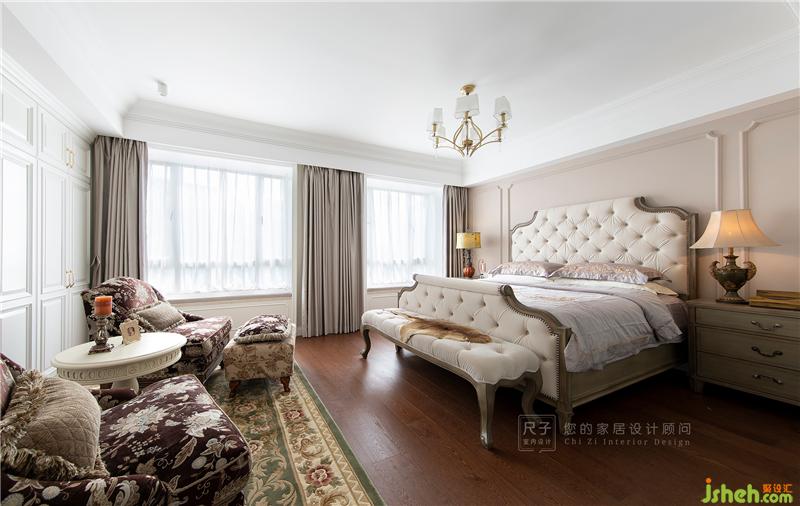 溫暖的米咖色配色,以及極具美式線條感的床具,搭配花色地毯、沙發(fā),沉穩(wěn)中又不乏活力,給人一種張弛有度的休閑感。