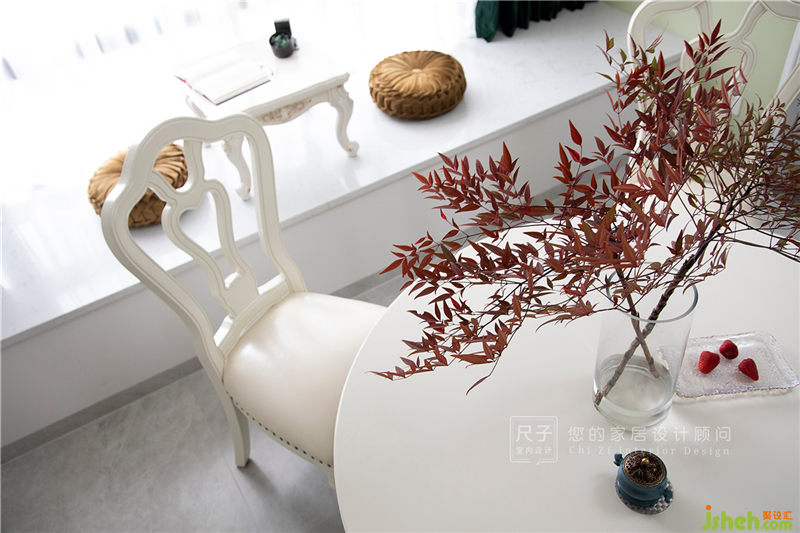 穿過門洞,是精致實(shí)用的用餐區(qū),大面飄窗為屋內(nèi)引入充足的自然光線,在白色木質(zhì)桌椅的映襯下,空間顯得更為明亮通透。
