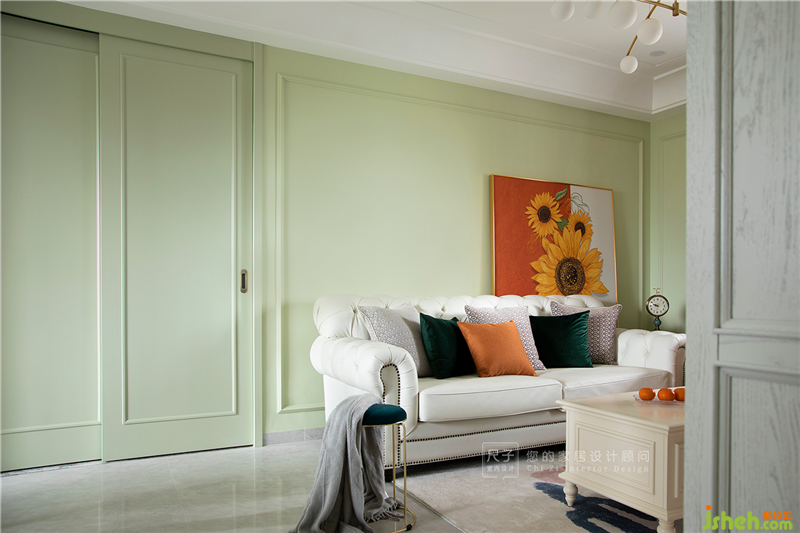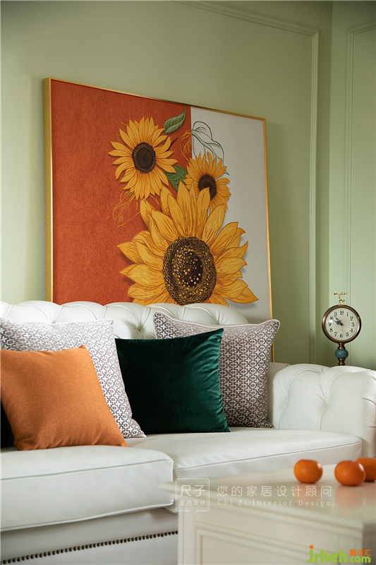 清透的綠色調(diào)游弋在客餐空間,搭配向日葵裝飾畫,對比強(qiáng)烈,大膽的配色讓室內(nèi)空間煥發(fā)節(jié)奏與活力。