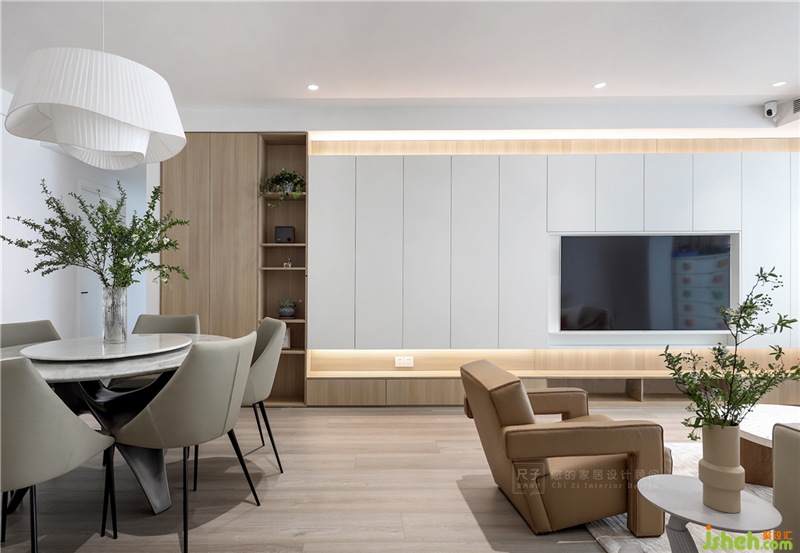 客餐廚一體化的布局,奠定了空間通透明亮基礎(chǔ),一整排橫跨客餐廳的儲(chǔ)物柜,可見(jiàn)這個(gè)家的收納能力。