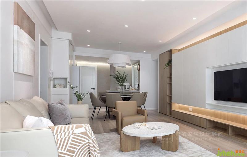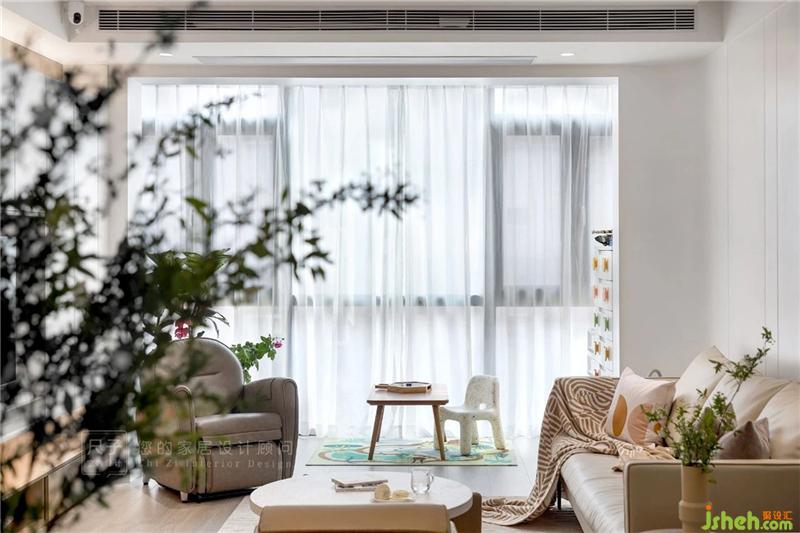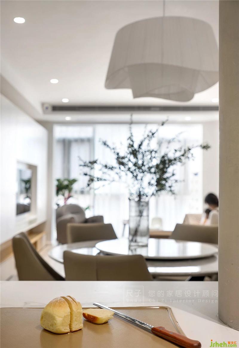 ①一體化公共空間:客餐廚完全打開(kāi),客廳陽(yáng)臺(tái)打通,擴(kuò)大室內(nèi)使用面積,改善公共空間采光通風(fēng)