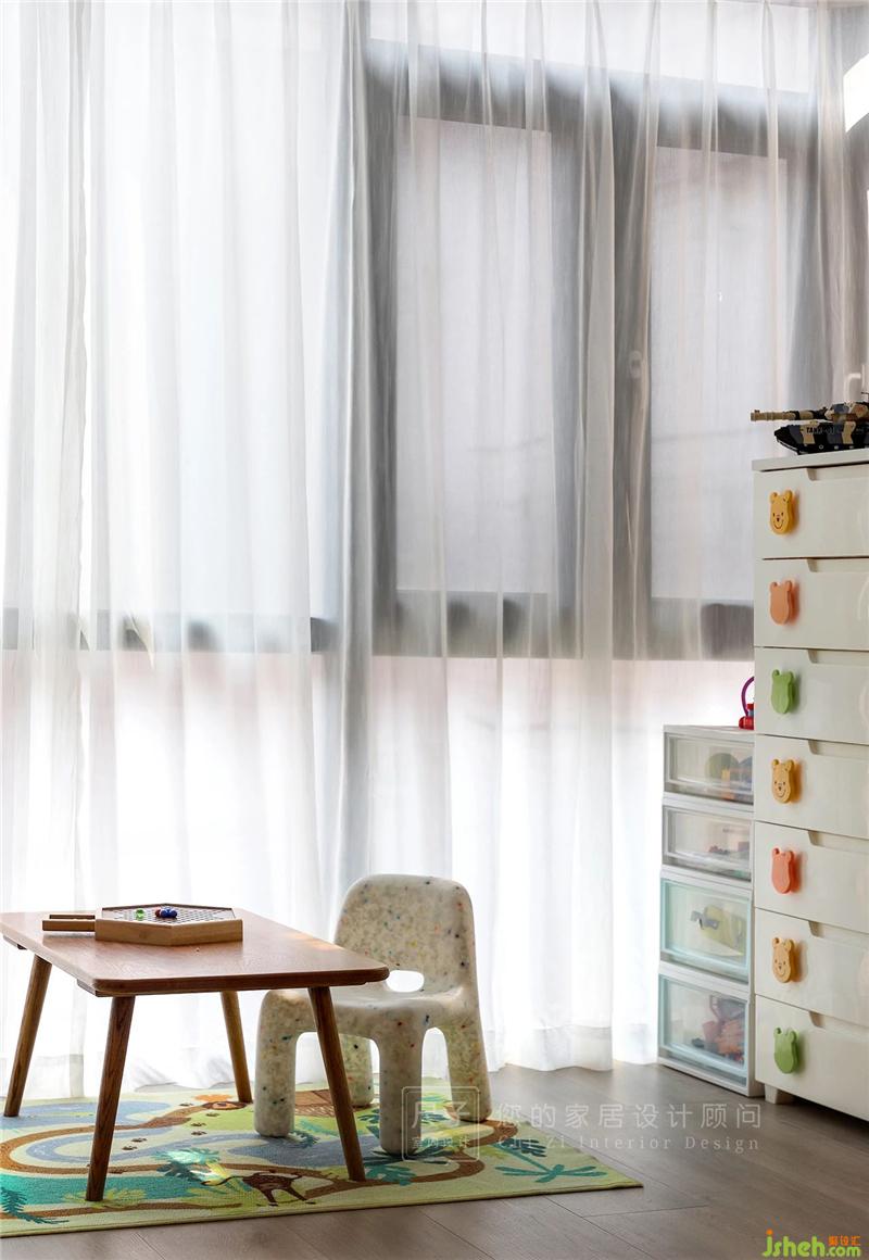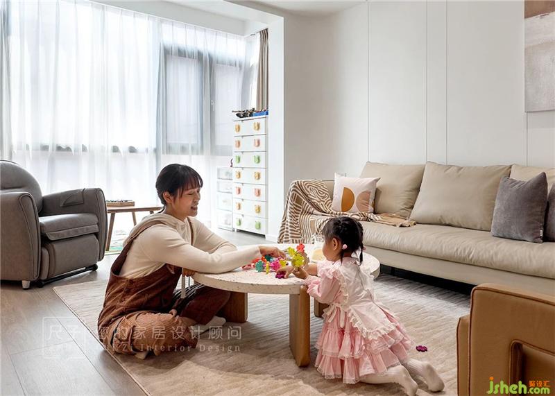 在這個(gè)三代同堂的家中,空間與空間的互通性、交流性是設(shè)計(jì)師考慮的第一要義。尺子室內(nèi)設(shè)計(jì)選擇將陽(yáng)臺(tái)擴(kuò)進(jìn)客廳,開(kāi)辟出一塊屬于孩子們的活動(dòng)區(qū),一塊親子交流的小天地。在任何一個(gè)平凡的午后,與家人在客廳沏上一壺茶小敘生活,或是同孩子在這里搭建“城堡”、嬉戲歡騰,便是最真實(shí)的幸福。