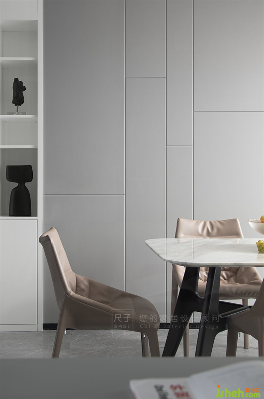 于是設(shè)計師做了一排隱形的柜門,“看不見”的收納讓餐廳顯得更加簡潔;可以180°打開的柜門,既能實現(xiàn)長期的收納需求,也可以滿足用餐期間臨時放置物品的需求。