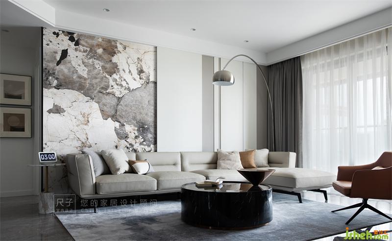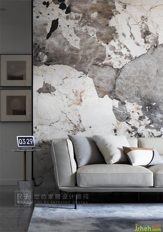 巖板背景墻結(jié)合高低錯(cuò)落、灰白相間的背板,材質(zhì)的碰撞與層次感的處理,成為客廳里一道亮眼的風(fēng)景線。