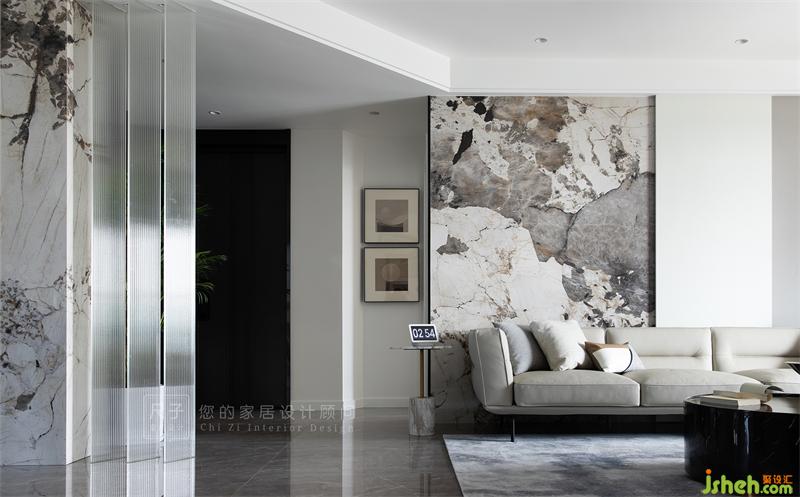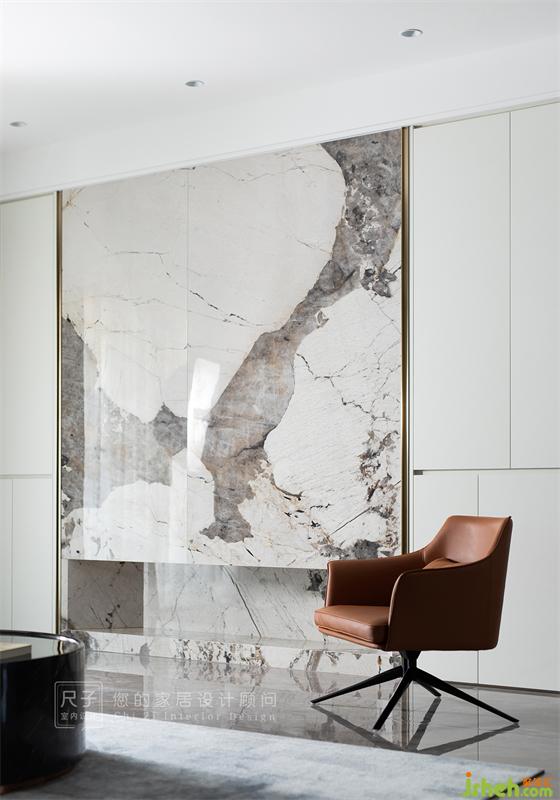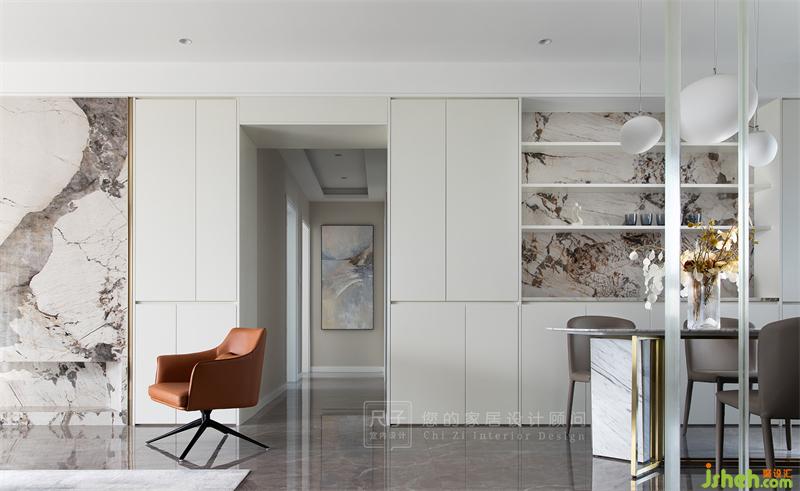 屋主夫妻倆希望家在淺色調(diào)的基礎(chǔ)上,保持質(zhì)感與層次;設(shè)計(jì)師以巖板材質(zhì)的特性貫穿全屋設(shè)計(jì),復(fù)刻大自然石材逼真的紋理、色彩和質(zhì)感,打造雅致輕奢的空間美學(xué)。
