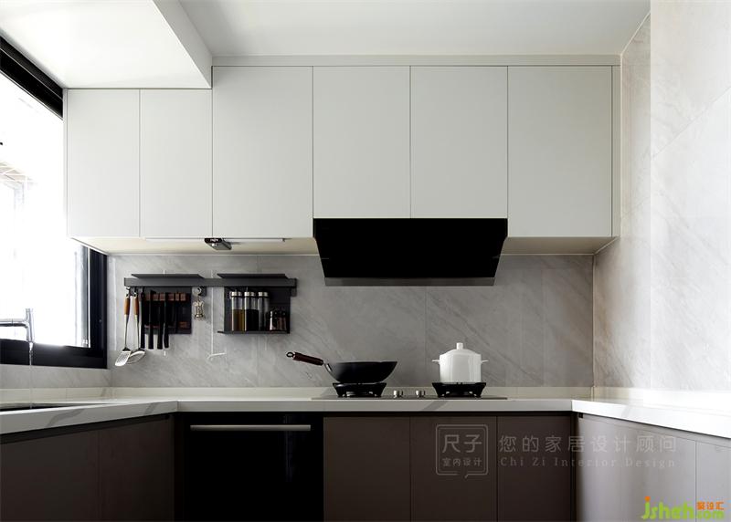 廚房外擴,借用部分生活陽臺的空間來增加廚房使用面積,亦解決了廚房的采光問題。