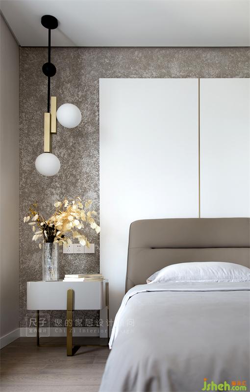 白色烤漆板組成的半圍合式床頭布局給人一種心理安全感,藝術涂料的色彩與紋理與之形成鮮明對比,不同材質的交匯融合營造出低調優(yōu)雅的居室氛圍。
