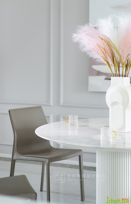 餐廚空間延續(xù)了灰白的配色,相較于客廳的華麗,這里更加簡(jiǎn)約精致。