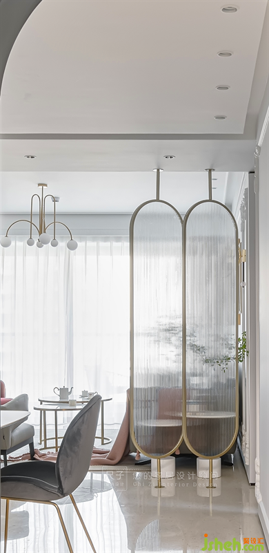 視線穿過圓潤的拱形門洞,金色的邊框與兩扇長虹玻璃組成屏風隔斷,影影綽綽中透出一絲客廳的模樣。