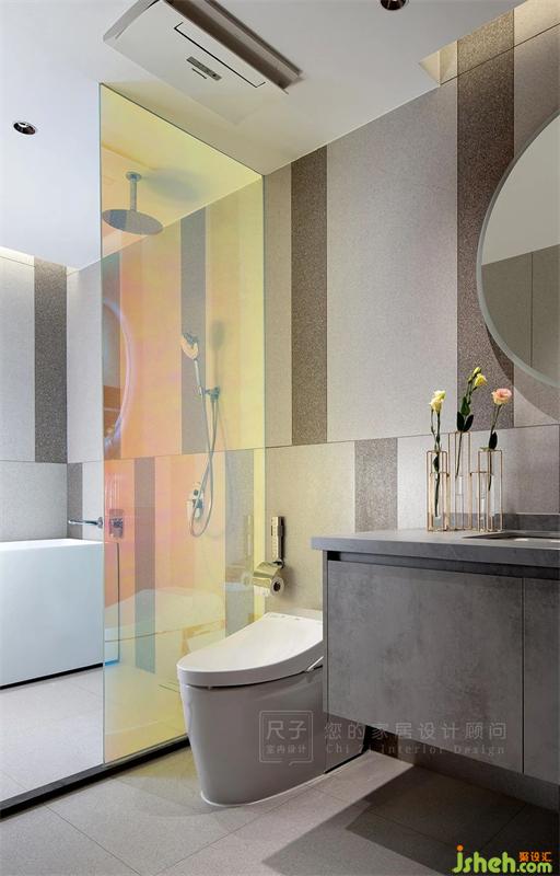 白色推拉門(mén)后是隱藏的主衛(wèi)空間,不同明度的灰色瓷磚搭配炫彩玻璃,在安靜的秩序中融入絢爛的美感。