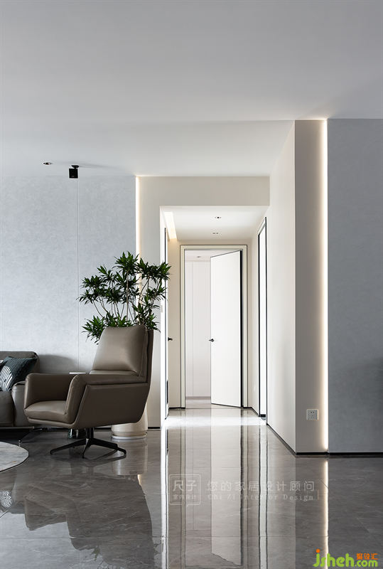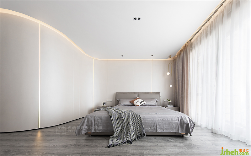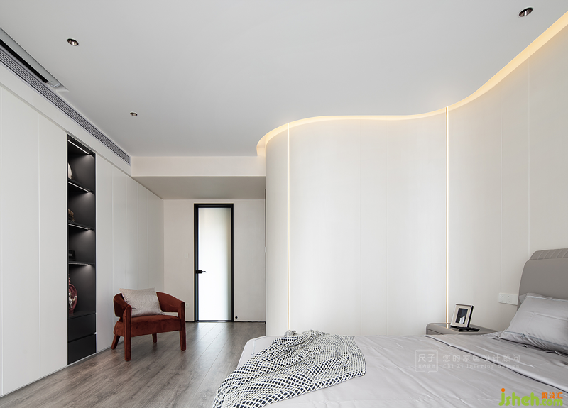 主臥色彩、裝飾簡單,家居設計以流暢的曲線勾勒出睡眠空間應有的柔軟感,燈條燈帶等點光源的設置讓空間呈現(xiàn)出干凈雅致而不落俗套的視覺效果。