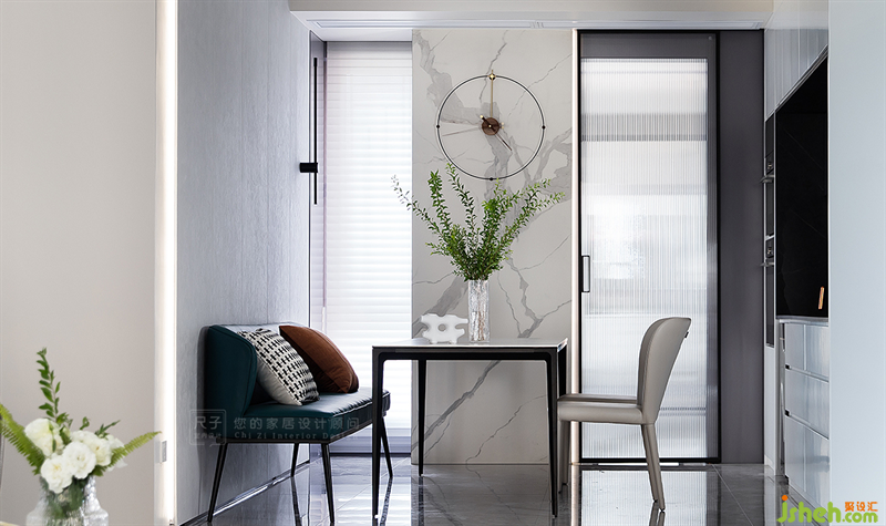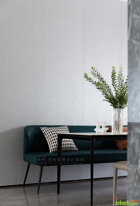 餐廳開間較小,我們選用0.8*2m的狹長餐桌+卡座式餐椅,節(jié)省空間的同時也方便照看孩子。 餐邊柜與電視柜色彩一致,另一側的背景墻則是和客廳沙發(fā)背景用了統(tǒng)一的藝術涂料,空間的整體性更強。