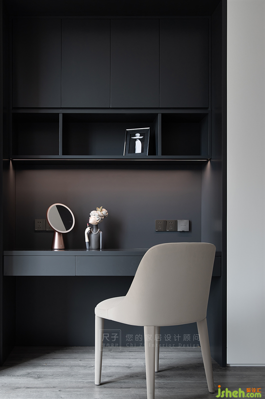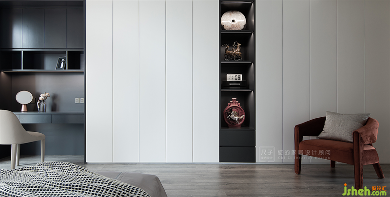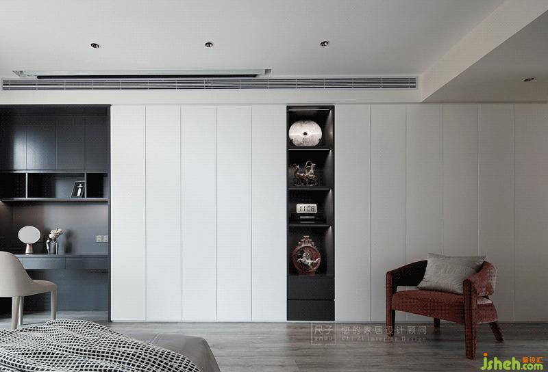 床尾整整8米的儲物柜,收納能力不輸衣帽間;投影儀的設置滿足夫妻倆的睡前觀影需求。