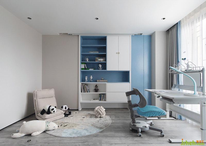 孩子們的房間更強調成長性和功能性,將原本的衛(wèi)生間拆除以擴大男孩房的面積,在這里開辟出一塊屬于孩子們的空間,增加了投影,方便姐弟倆在此一同玩耍或是上網(wǎng)課。
