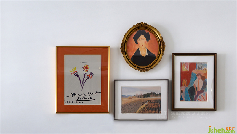 一組復(fù)古裝飾畫,豐富著空間的層次與精致感。