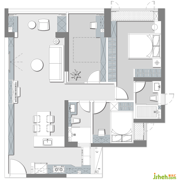 兩個(gè)陽臺均封入室內(nèi),擴(kuò)大客廳、書房以及廚房的使用面積
