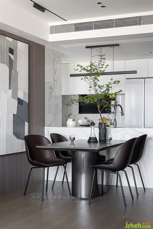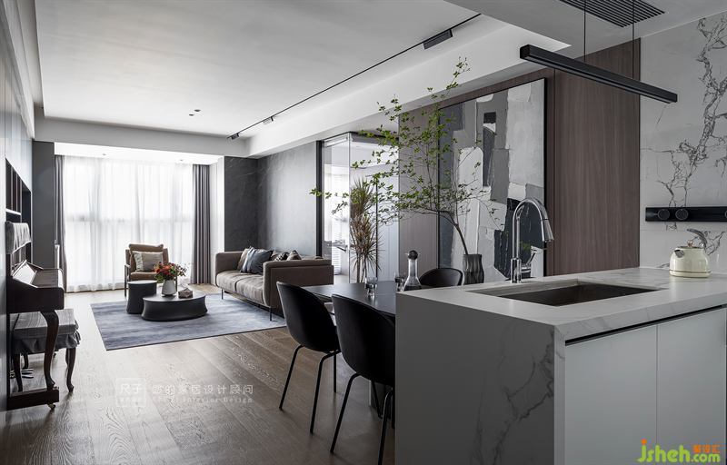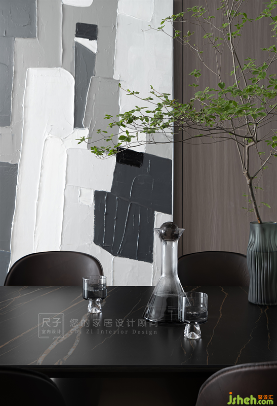 以巖板、玻璃以及木飾面板等材質(zhì)的碰撞,來詮釋空間質(zhì)感
