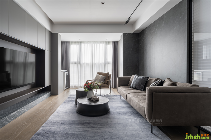 黑白灰與木色交替,足足8米長的儲(chǔ)物柜,將屋主對功能性與藝術(shù)感的追求融合;暖咖的皮質(zhì)沙發(fā)與柔軟的地毯,交織出空間的高級氣質(zhì),又不失家的松軟舒適感。