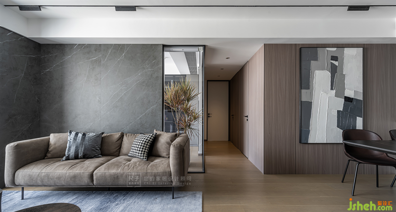 基于業(yè)主喜歡的低調配色與高級質感,我們以灰色巖板與通透的玻璃碰撞出一面獨特的沙發(fā)背景,低調細膩中形成和諧反差。