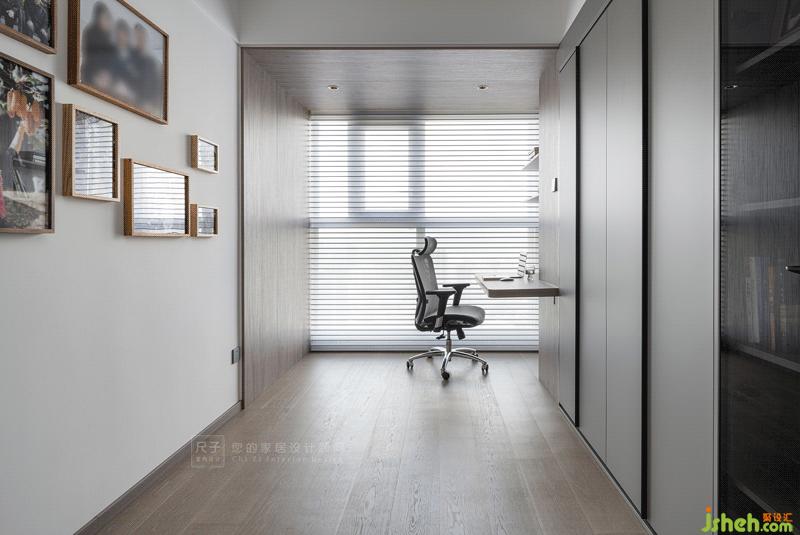 沙發(fā)玻璃墻背后便是半開放式的書房,原本的陽臺位置納入室內,天花與墻體以木飾面板包裹,圍合成一方工作區(qū)。