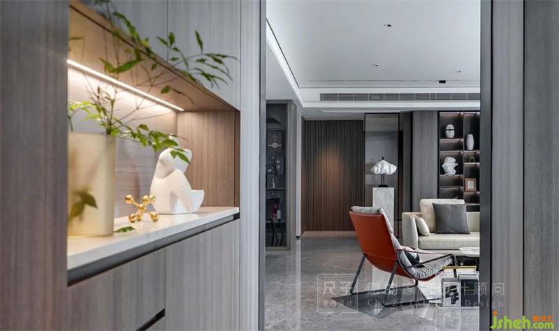 透露著現(xiàn)代氣息的玄關由灰棕色木飾面板裝飾包裹而成,開放格和通透的長虹玻璃推拉門,構(gòu)成了張弛有度的設計效果,打破空間的沉悶無趣,使家居生活更加愜意舒適。