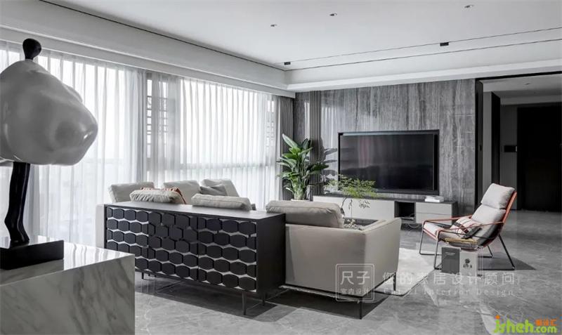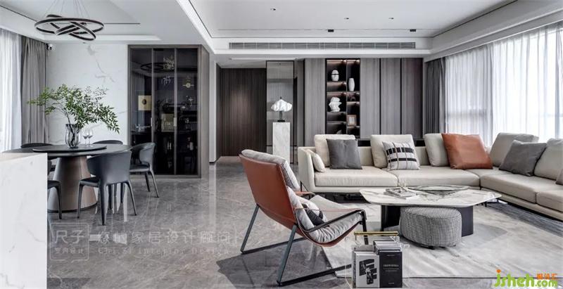 大氣開闊的空間內(nèi)以黑色巖板+不銹鋼格柵作為電視背景延伸至餐廳,在序列般的空間布局里,扮演起中部支柱的角色。