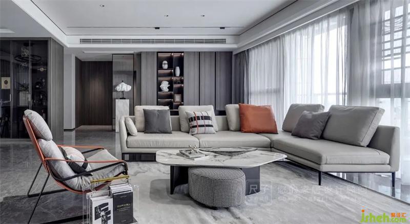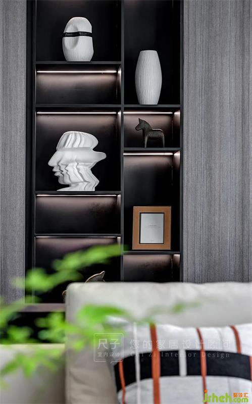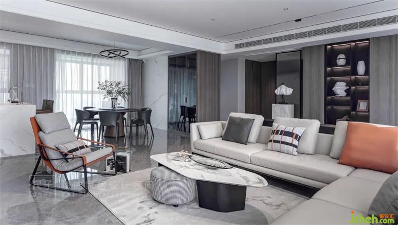 客廳盡頭的柜子與玻璃屏風組合延續(xù)著玄關的設計元素,空間是聯(lián)系的;圍合式的沙發(fā)與地毯組合,透露著悠閑安然的氣息,讓一家人身處其間便能身心放松、卸下疲憊。