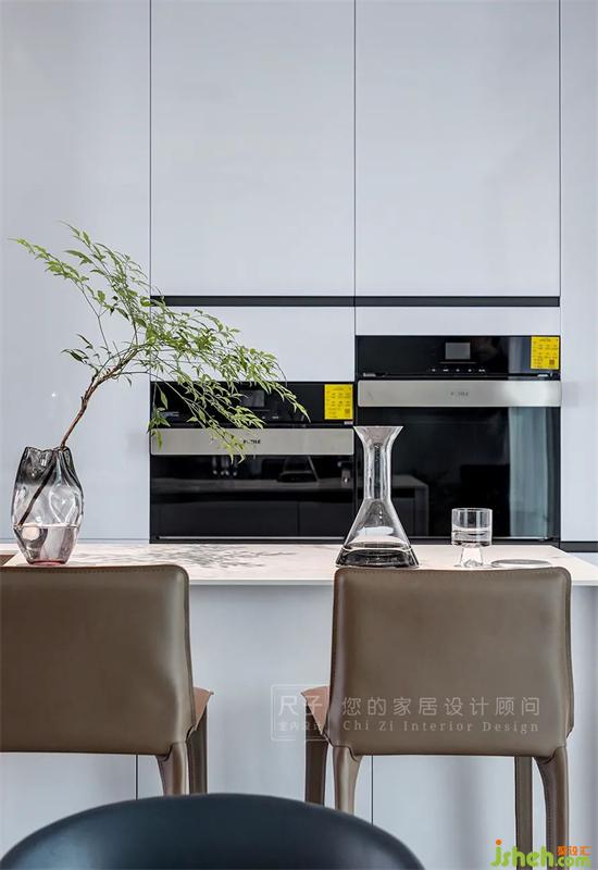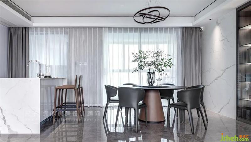 白色的島臺(tái)與圓形餐桌讓空間動(dòng)線靈活流暢,蜿蜒的圓形吊燈與透明酒柜將用餐的氣氛渲染得溫馨浪漫,以靈活的功能和動(dòng)線組合,讓家居生活更為便捷,營(yíng)造了豐富的生活視角。