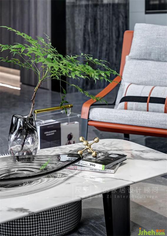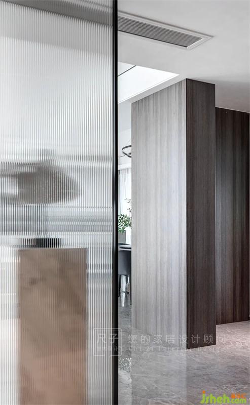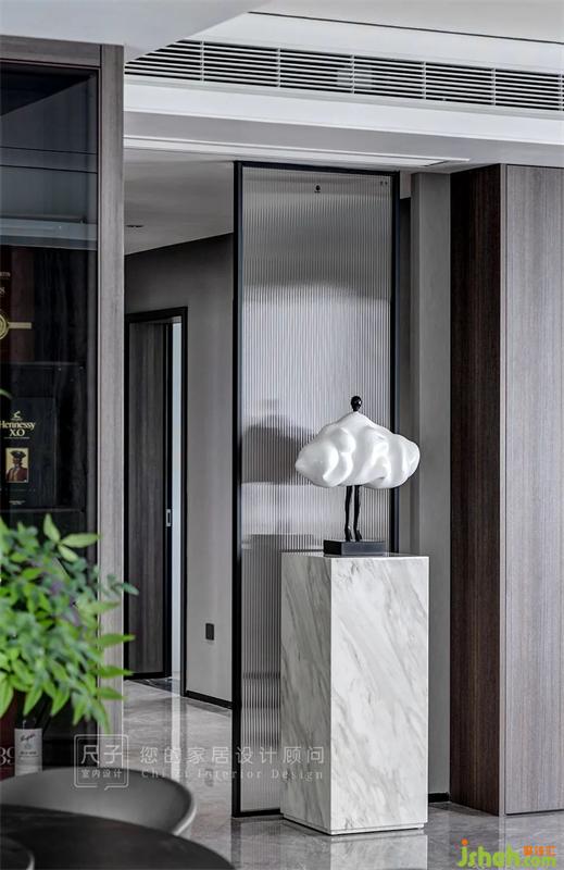 過道區(qū)域以一扇長(zhǎng)虹玻璃隔斷+石材立柱作為端景,也能避免入戶直沖臥室門的忌諱。