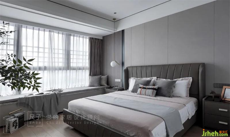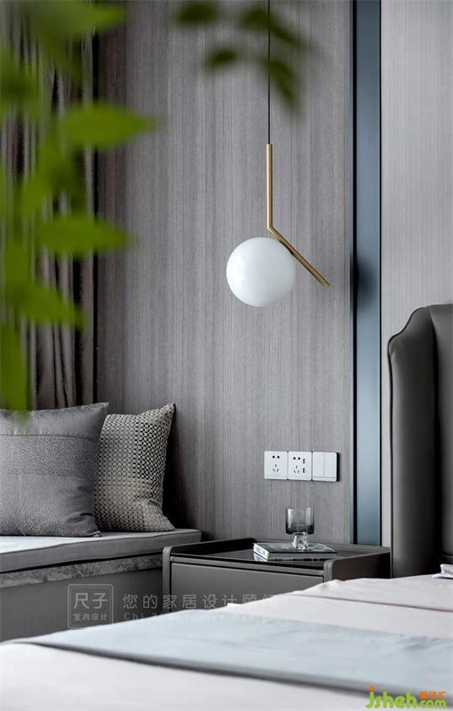 主臥的基調(diào)依舊是業(yè)主喜歡的黑白灰,相比公共空間更注重實(shí)用和舒適性。