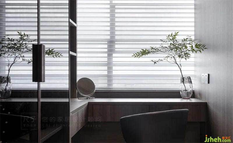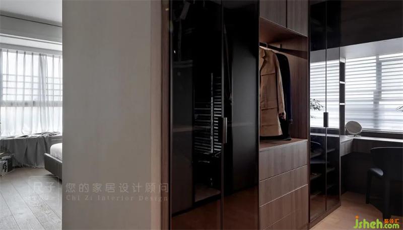 主臥增加了衣帽間做套房形式的設(shè)計(jì),床側(cè)是到頂?shù)碾p排柜圍合出寬闊的衣帽間。