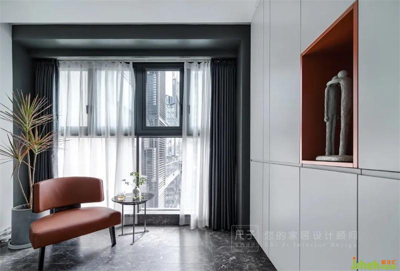 進(jìn)門(mén)后是面積7㎡的獨(dú)立門(mén)廳,我們將這塊空間規(guī)劃為休閑+收納區(qū),定制了到頂?shù)膬?chǔ)物柜,精裝房改造以深黑色墻漆包裹住落地窗,與深色地磚搭配一同限定出一片靜謐的休閑區(qū)。