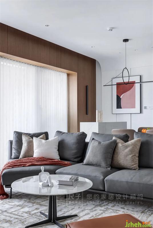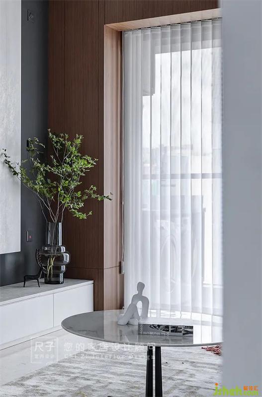橫跨客餐廳的落地窗用木飾面包裹,為了最大化地保留通透光感,沒(méi)有安裝普通的布簾及紗簾,而是安裝了豎百葉簾。