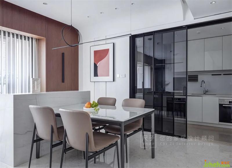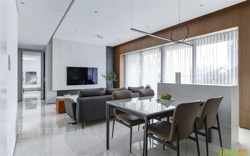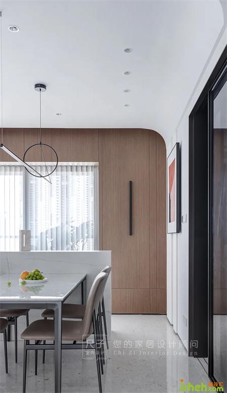硬裝是干凈的純白色,墻面以波浪板裝飾,讓空間更有靈動(dòng)韻律感,搭配一體化的島臺(tái)餐桌,營(yíng)造出一種現(xiàn)代時(shí)尚的高級(jí)空間感。