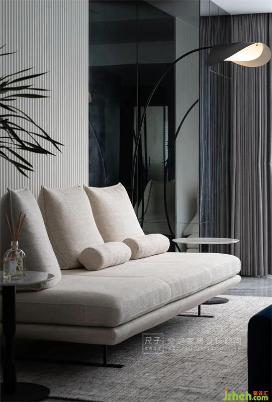 白色的波浪板向外延伸,搭配灰鏡裝飾及鏡面柜門,構(gòu)成了層次分明的沙發(fā)背景,同時(shí)弱化了原陽臺(tái)區(qū)域的承重柱;電視柜一側(cè)的墻面則是做了弧形處理,以追求更好的視覺包容感。