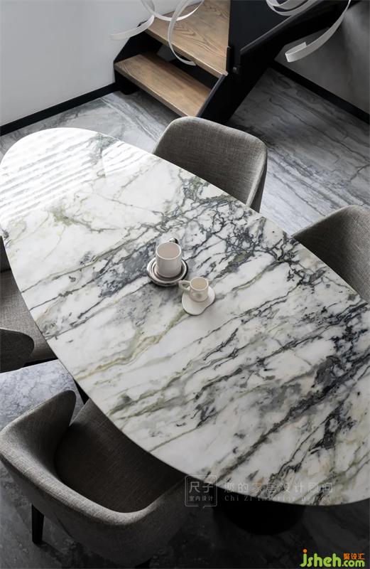 形式追隨功能,橢圓的餐桌臺(tái)面與地面瓷磚紋理相呼應(yīng),開放式的餐邊柜以及白色造型燈具,豐富著室內(nèi)空間。