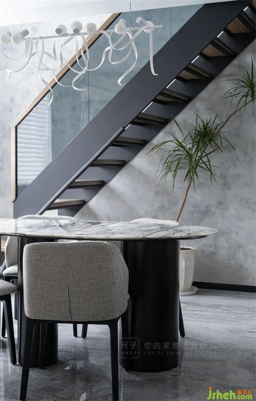 頂樓復(fù)式設(shè)計樓梯是動靜分區(qū)的過渡地帶,黑色鋼架結(jié)構(gòu)與灰玻的搭配,簡約亦有質(zhì)感,木色踏板與扶手則展現(xiàn)著空間的溫柔與暖意。