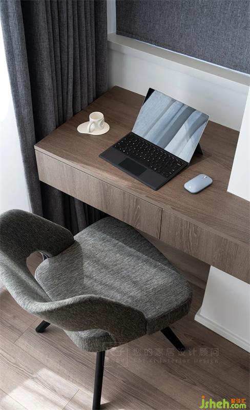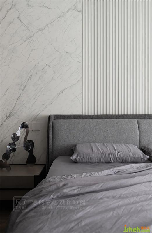 主臥以套房形式設(shè)計,更注重實(shí)用和舒適性。封了陽臺作為休閑+閱讀學(xué)習(xí)區(qū);睡眠區(qū)的床頭背景墻是巖板+波浪板的造型,清新明快,簡約卻不乏質(zhì)感。