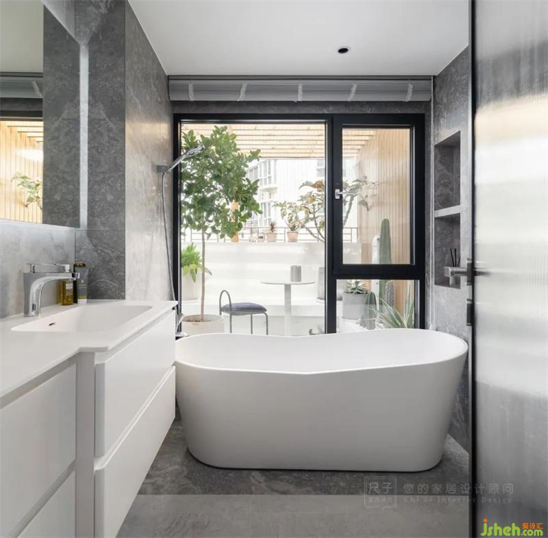 頂樓復(fù)式設(shè)計主衛(wèi)向陽臺方向進(jìn)行了擴(kuò)充,臨窗砌置了一個大浴缸,通透的玻璃將陽臺的風(fēng)格帶入洗浴空間,盡顯品質(zhì)生活。